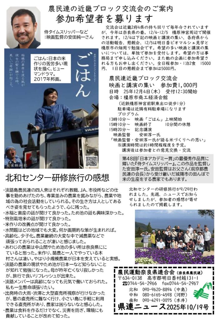 12/4は下記の映画と講演の集い、各府県からの活動報告、懇親会、12/5は明日香ビオマルシェ見学と橿原市の畑周り勉強会です。