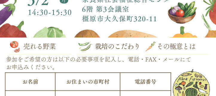 参加希望の方はお名前、電話番号、住所を下記までお申し込みください。 連絡先TEL 0744-54-2966FAX 0744-54-2967MAIL noumember@nara-nouminren.jp