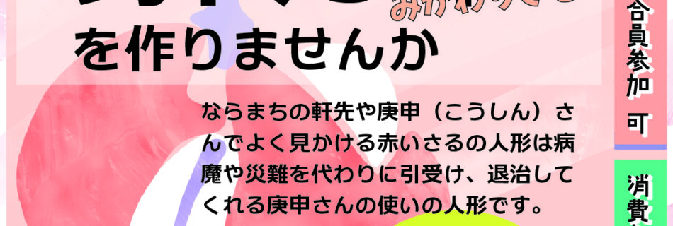 奈良県農民連女性部 春のワークショップ 「ならまちのシンボル身代り申(みがわりざる)を作りませんか」 ならまちの軒先や庚申(こうしん)さんでよく見かける赤いさるの人形は病魔や災難を代わりに引きうけ、退治してくれる庚申さん …