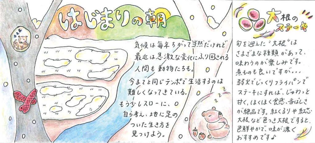 みちくさ便り「はじまりの朝」、奥恵一郎さん、2月は野菜の甘くなる季節がやってきました!&いちごの季節到来、當麻の家「手作り味噌」