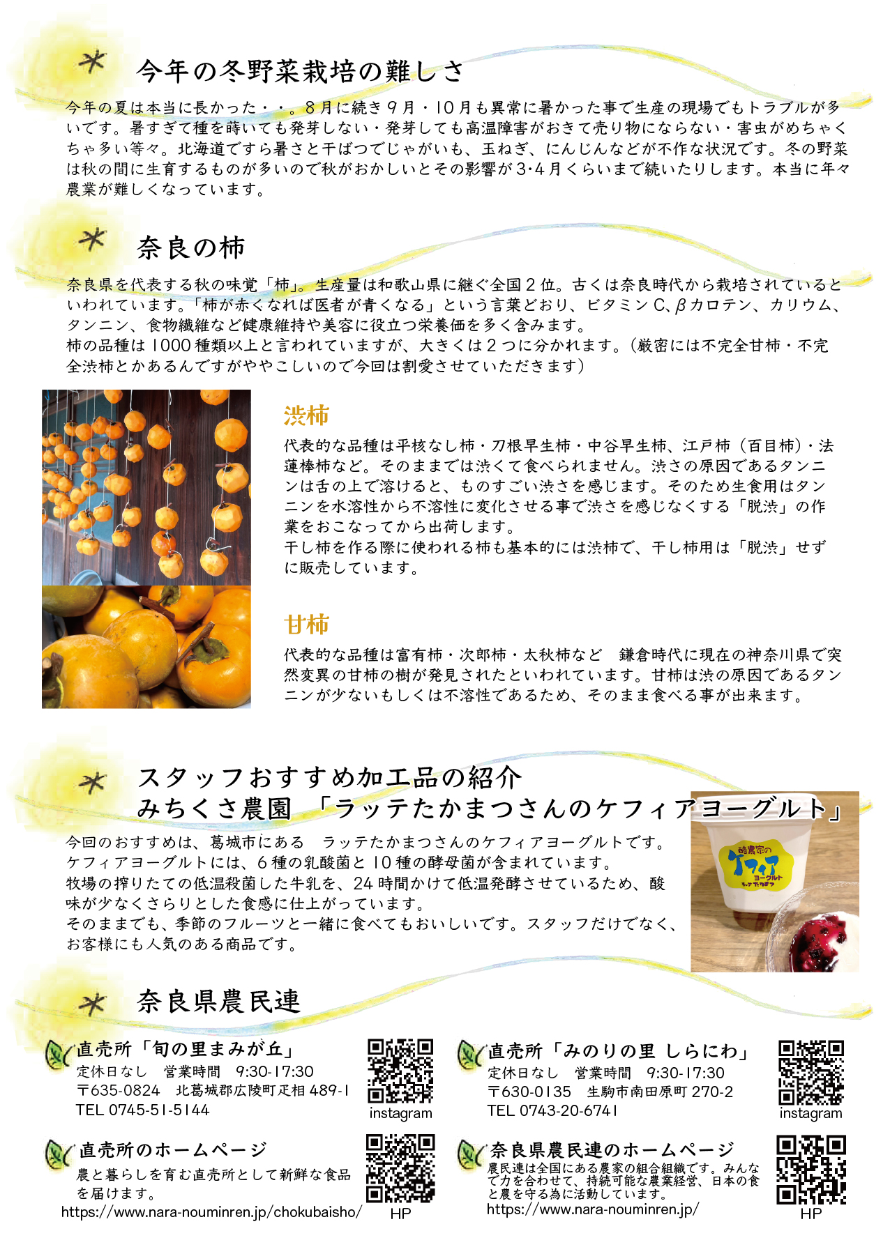 みちくさ便り「もみひろい」、天理市「はっぴー農園」の山本朋史・こず恵さん今年の冬野菜栽培の難しさ、奈良の柿ラッテたかまつさんのケフィアヨーグルト